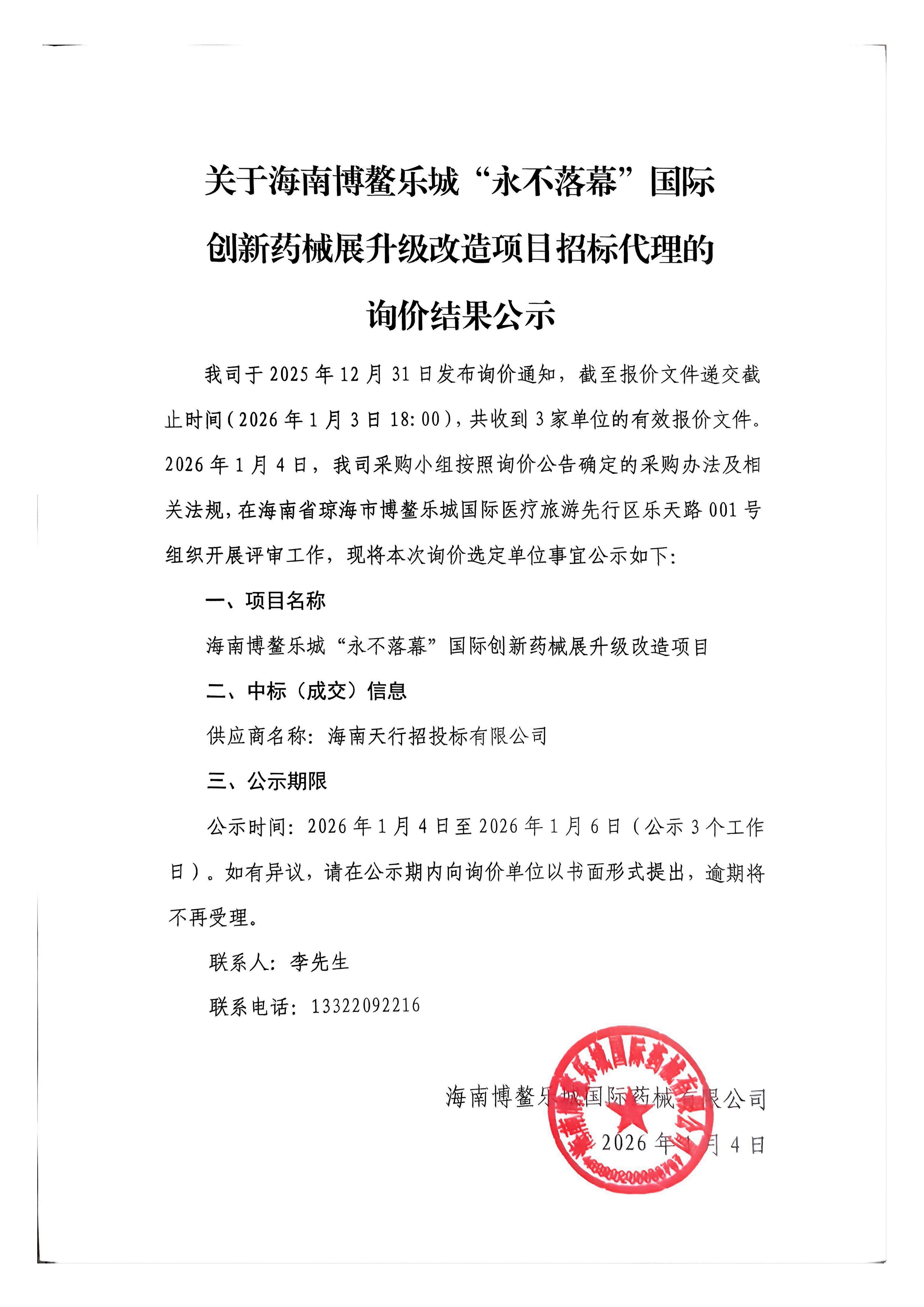 关于海南博鳌乐城“永不落幕”国际创新药械展升级改造项目招标代理的询价结果公示